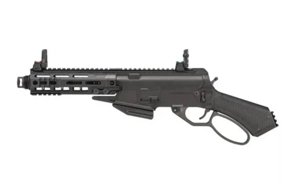 Deze G&G LevAR 7 GBB lever action airsoftreplica is een ware mengelmoes van oud en nieuw. Het is namelijk het lever action systeem van bijvoorbeeld de Winchester Model 1873, maar dan gehuld in een zeer modern en tactisch ogend jasje. En natuurlijk uitgevoerd als GBB airsoftreplica. De LevAR is een enkelschots lever action replica en het gas dat je gebruikt om de BB’s uit het 35 BB magazijn te verschieten kan geladen worden via de vulpoort aan de onderzijde van de greep. Die greep is aan weerszijden voorzien van een ruwe textuur voor wat extra houvast en dat is maar goed ook. Omdat de G&G LevAR 7 GBB airsoftreplica gebruikmaakt van een spanhevel die vastzit aan de trekkerbeugel, zul je de greep na ieder schot weer los moeten laten om de replica te cyclen. Het is dan wel zo prettig als je de greep daarna meteen weer stevig in de hand kunt nemen, zodat je er zo stabiel mogelijk mee kunt richten. Gelukkig is deze 7’’ uitvoering kort genoeg dat je hem stevig bij de handguard vast kunt houden met je vrije hand en hem in balans kunt houden. Het magazijn zit net voor de trekkerbeugel en heeft een capaciteit van 35 BB’s, maar de LevAR is ook geschikt voor M4 AEG magazijnen